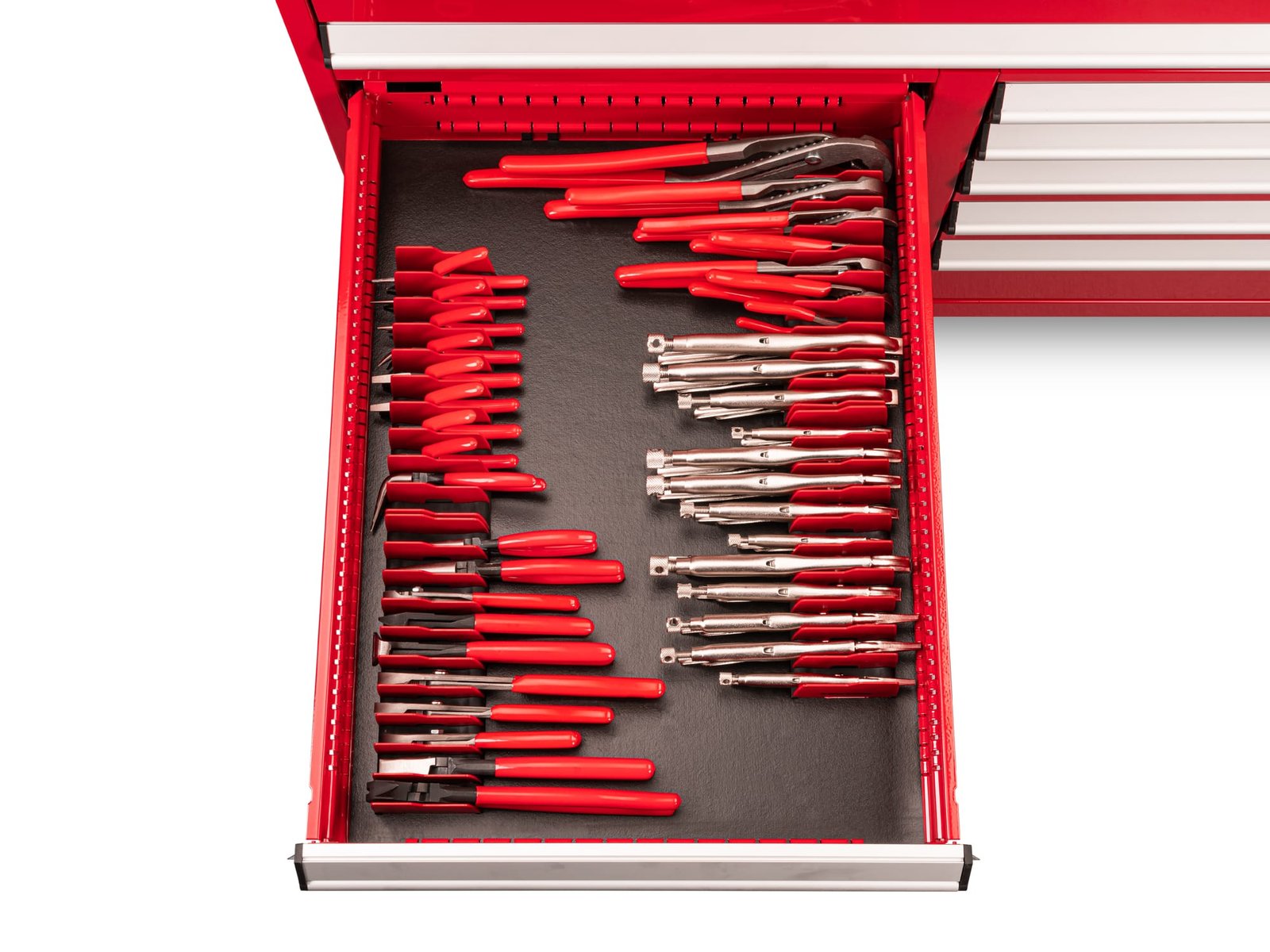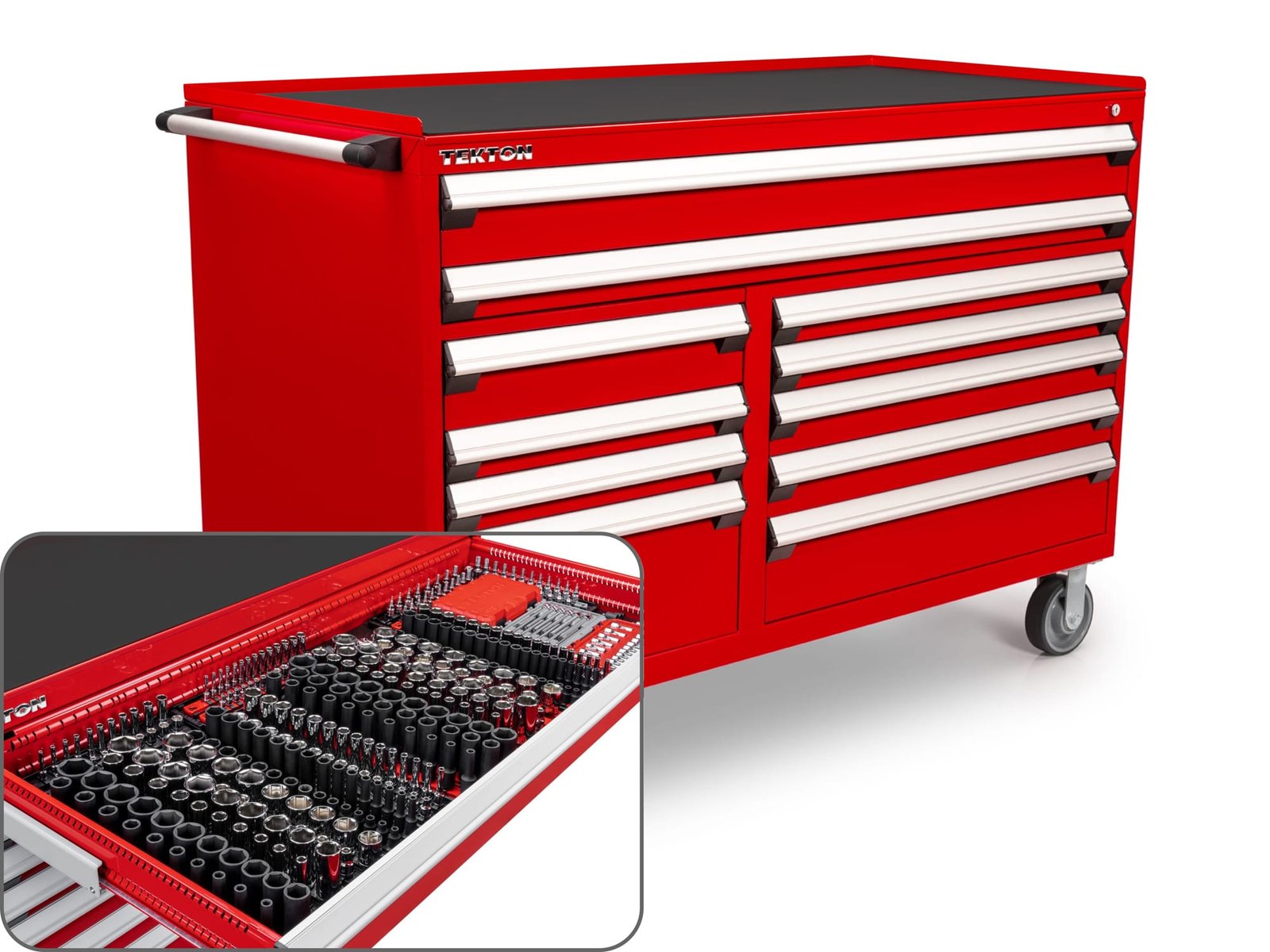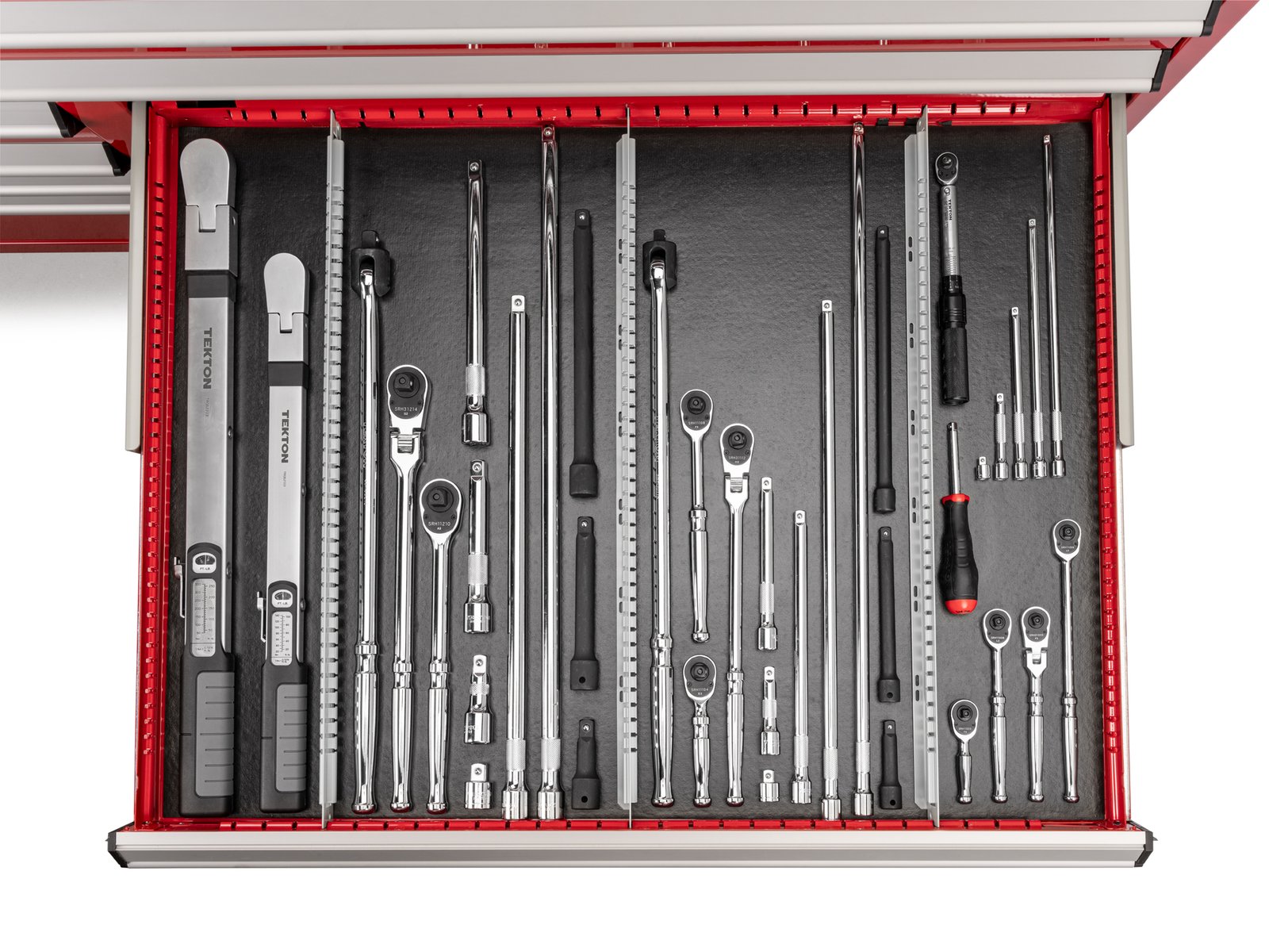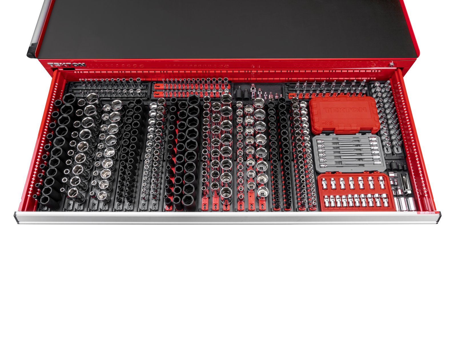 This bundle consists of a comprehensive mechanic’s tool set and tool cabinet. The selection of tools—including hand drive and impact drive sockets with no skipped sizes, wrenches, screwdrivers, and pliers—is designed to fit the drawers of the corresponding cabinet and includes all organization products.